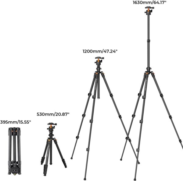The tripod features a 360-degree ball head that allows for smooth and precise camera movements, ensuring that you can easily adjust your shot to get the perfect angle. With a load capacity of 8kg/17.6lbs, this tripod can support a wide range of DSLR cameras and lenses, as well as smartphones for live streaming and vlogging.